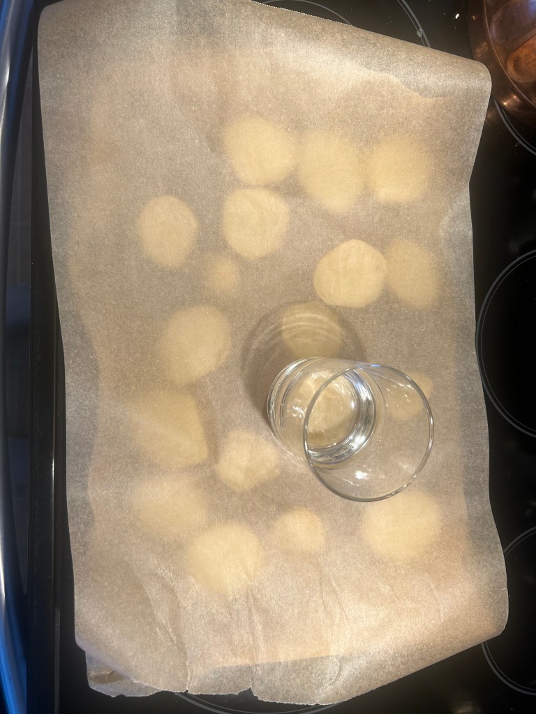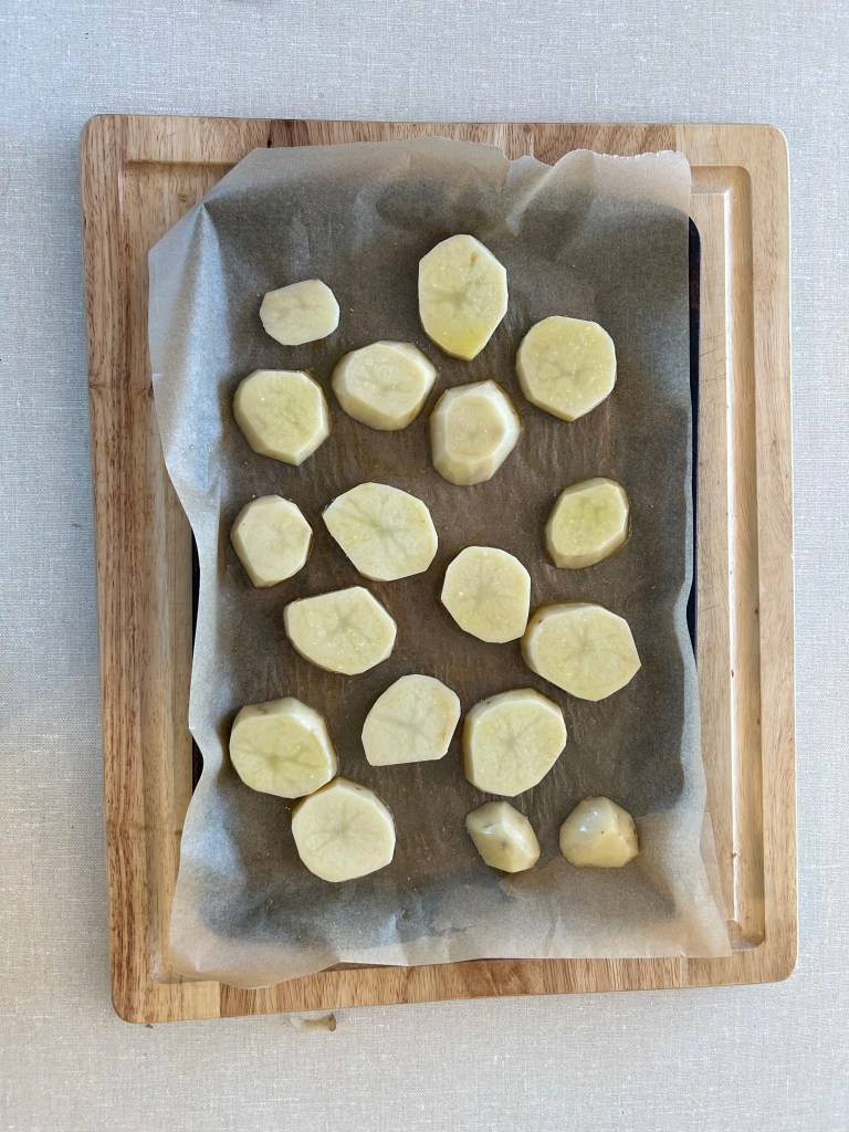 - Smash the Potatoes: After the initial 30 minutes of baking, remove the baking sheet from the oven. Carefully cover the potato slices with another piece of parchment paper. Then, using a wide-bottomed cup or the bottom of a glass, gently press down on each potato slice to smash it slightly.