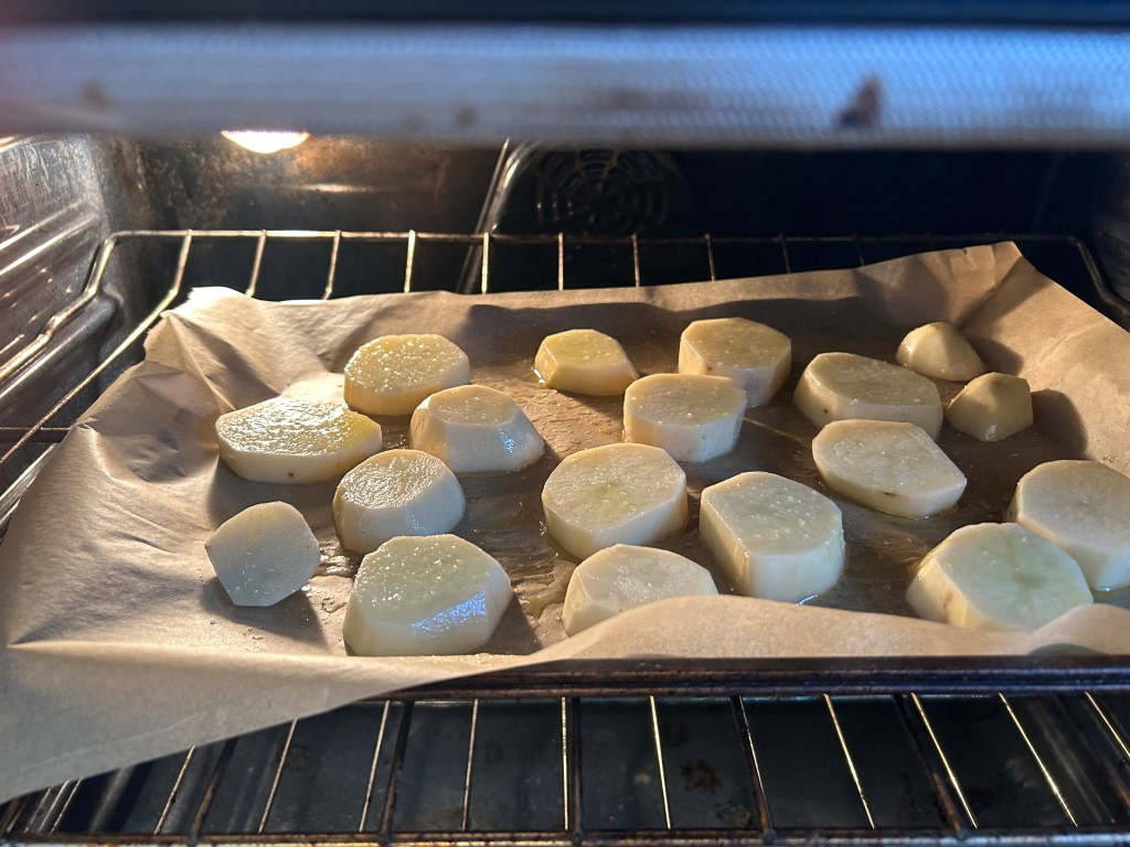 - Bake the Potatoes: Arrange the potato slices on the prepared baking sheet in a single layer. Spray or lightly brush the slices with cooking spray or olive oil. Season with salt and pepper to taste. Place the baking sheet in the preheated oven and bake for 30 minutes, or until the potatoes are tender and slightly golden.