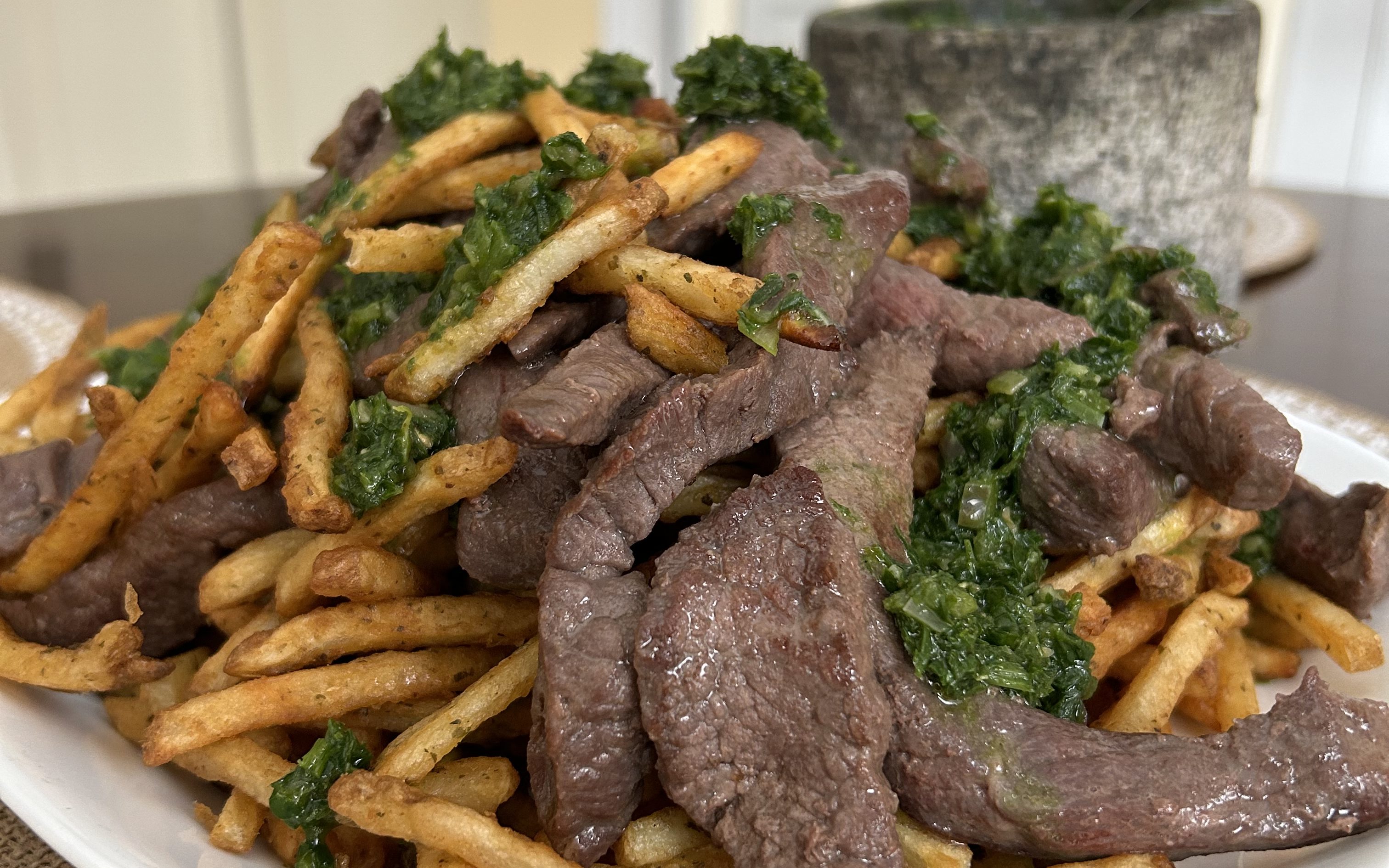 - Plate fries first, top with steak, and cover with your chimichurri. Keep some for the side because this stuff is DELICIOUS.